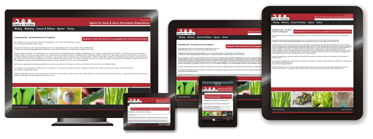 Überlassen Sie Ihrem Kunden die Wahl, welches Endgerät (Smartphone, Tablet oder Desktop) er bevorzugt. Responsive Internetseiten, also Internetauftritte, die so programmiert wurden, dass sie die Bildschirmgröße des jeweiligen Endgerätes, auf dem sie gerade aufgerufen werden, automatisch erkennen, und sich dementsprechend anpassen, sind dazu ein empfehlenswertes modernes Mittel.