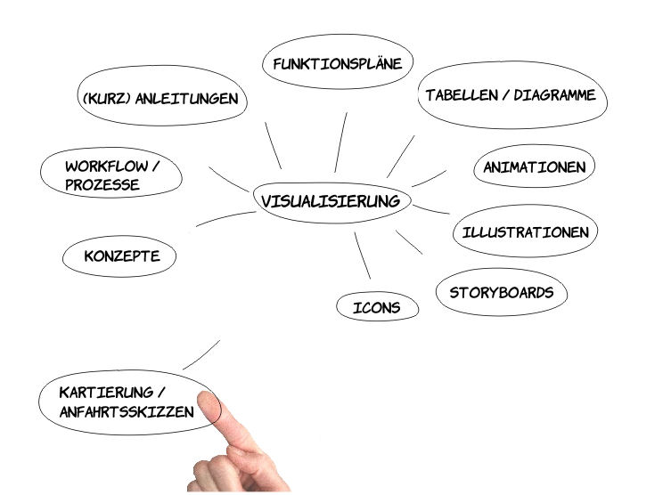 Wir erstellen für Sie unter anderem: Prozessvisualisierungen, Konzepte, Funktionspläne, (Kurz-)Anleitungen, Tabellen, Diagramme, Anfahrtsskizzen, Animationsfilme (mit / ohne Vertonung), Illustrationen, Story-Boards, Cartoons, …